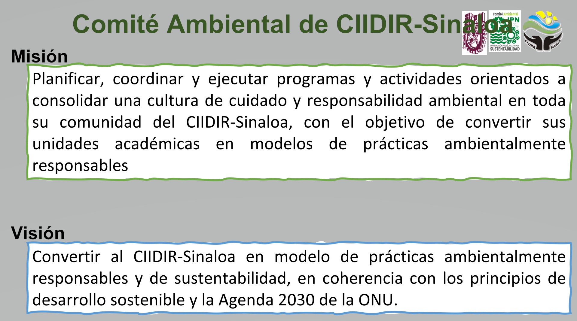 El Comité Ambiental de CIIDIR-Sinaloa tienen como prioridad impulsar actividades sustentables dentro de nuestra unidad politécnica, las cuales incluyen el Fomento de la incorporación del desarrollo sustentable en la enseñanza e investigación; la Gestión sustentable del campus; y la Participación social, vinculación y difusión.